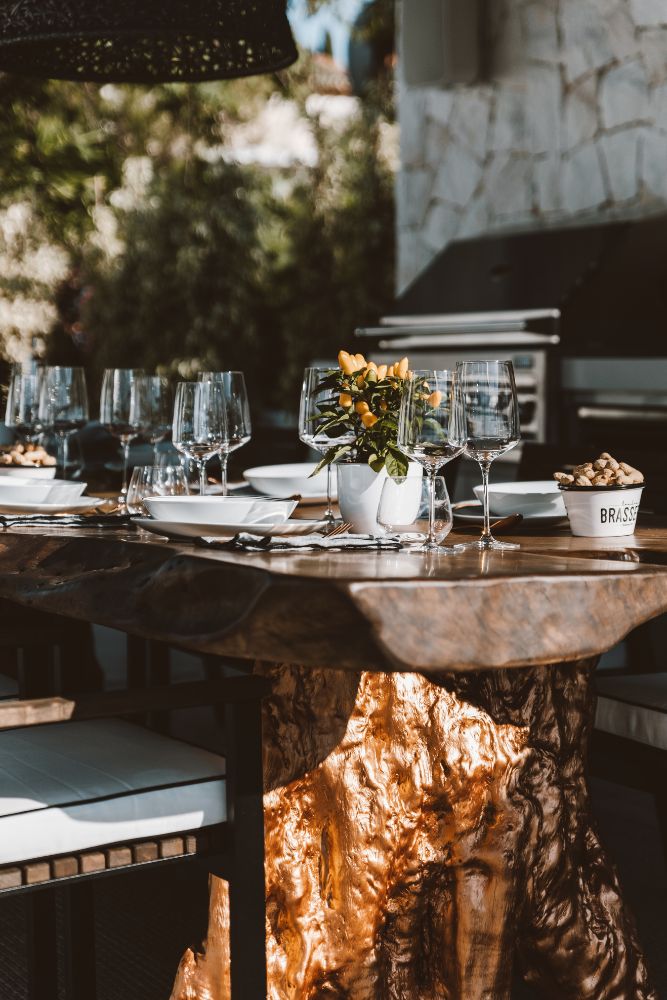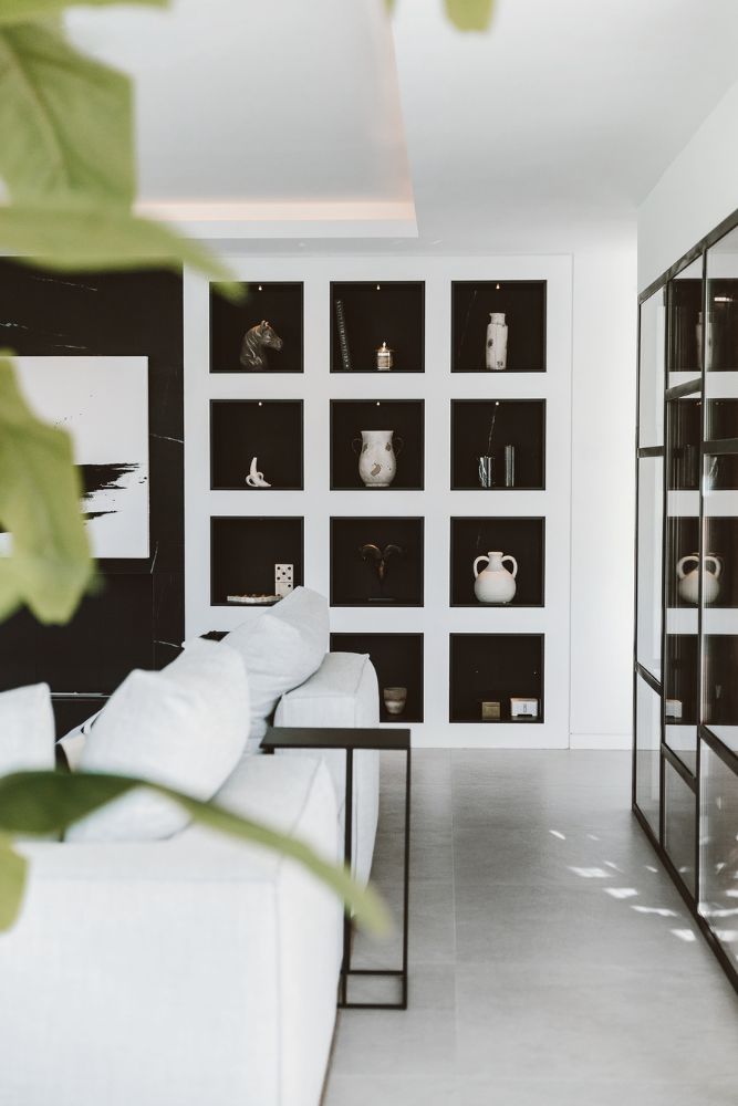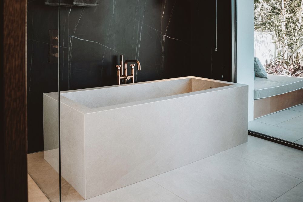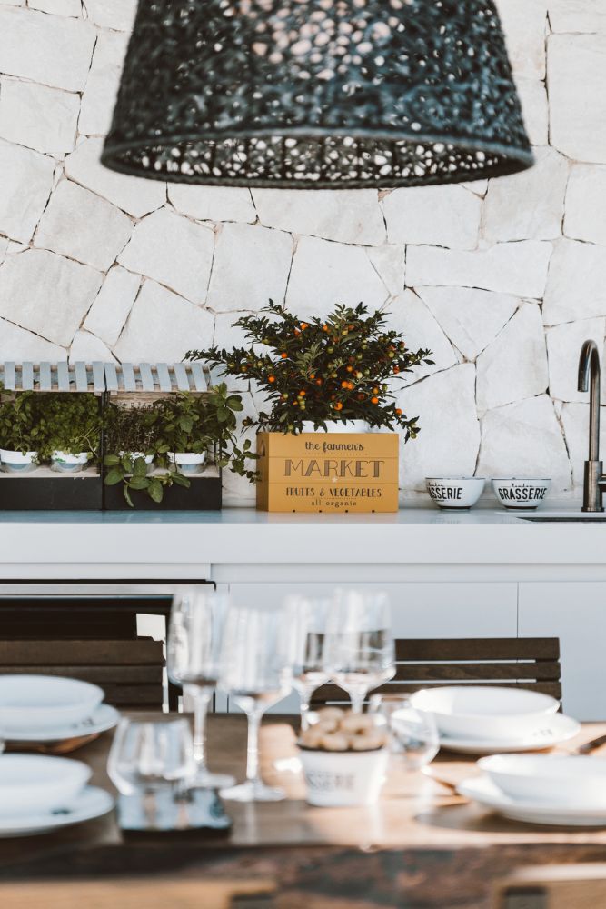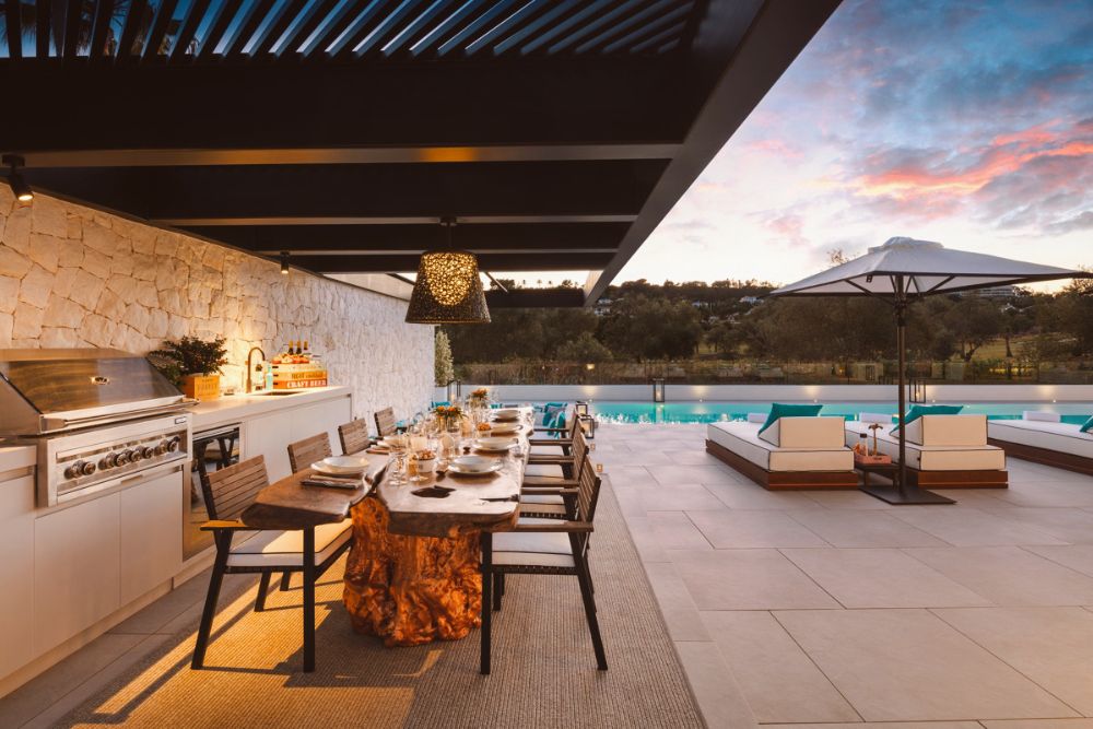 Bathrooms are finished with matte black marble and Gessi taps in a black bronzed finish — a rare but striking combination. In contrast, a soft grey stone flooring flows throughout the interiors, continuing out to the terrace and reappearing in the kitchen island and the built-in gazebo, creating a seamless connection between inside and out.