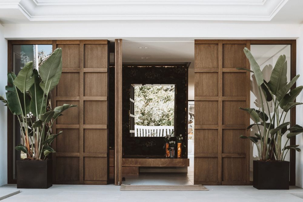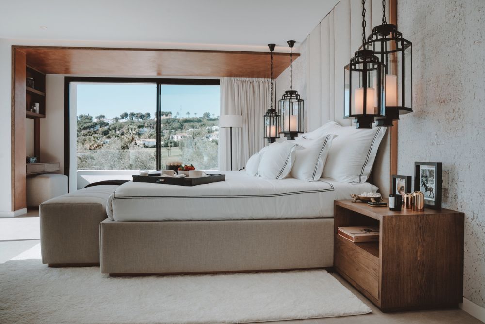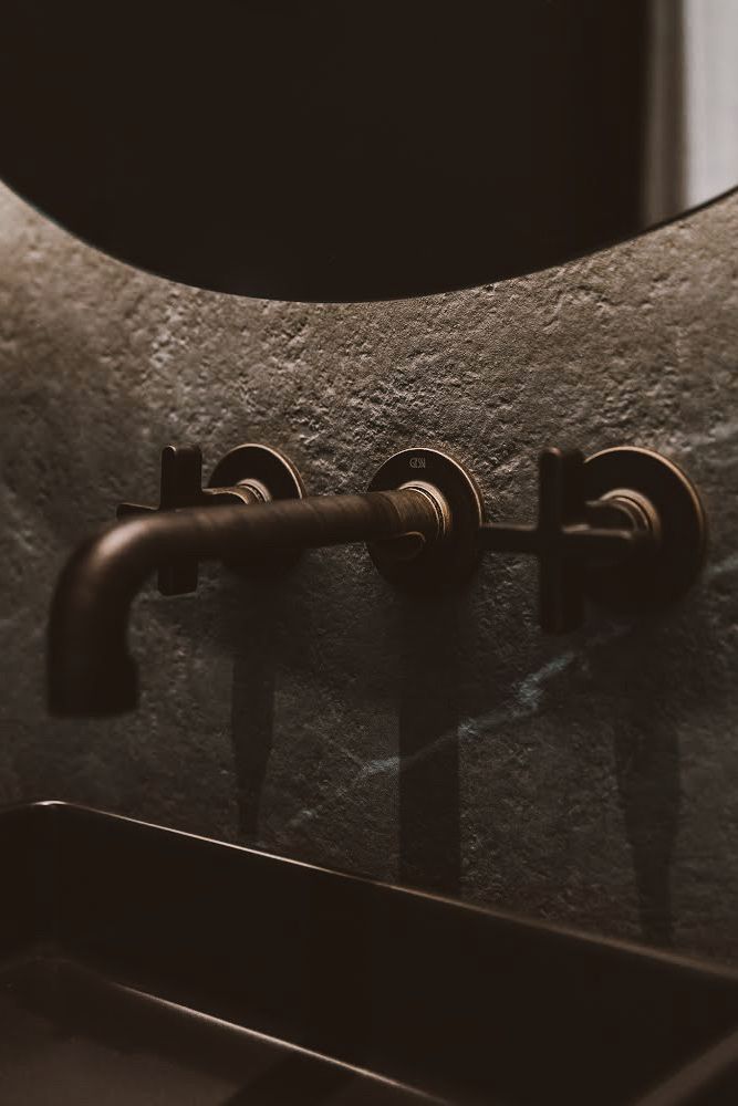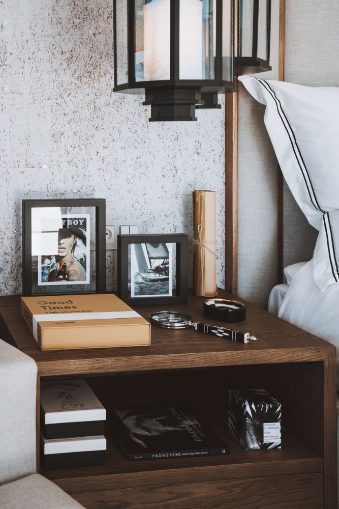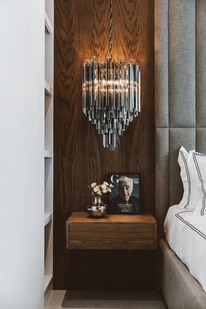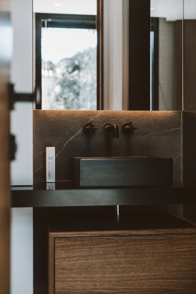 Natural wood elements bring a sense of balance to the darker tones. You’ll find them in the side tables, bathroom cabinetry, and solid oak doors, adding texture and warmth to each space.
