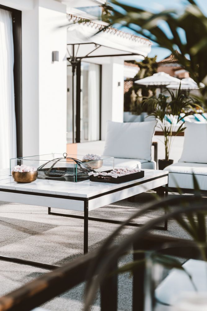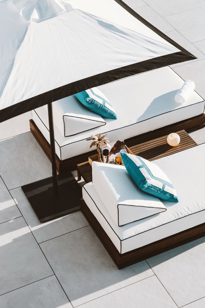 Every outdoor area invites relaxation — from the swim-up bar with built-in stools to the seating areas with fireplace tables. Copper details appear again in the Brutal Beauty tables, gently continuing the design theme from the interior to the outdoors.