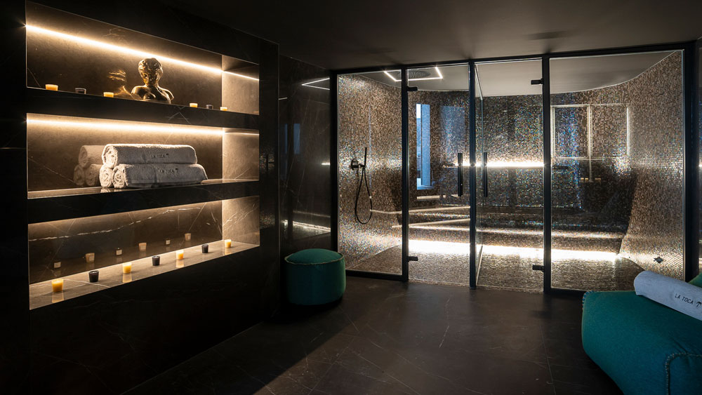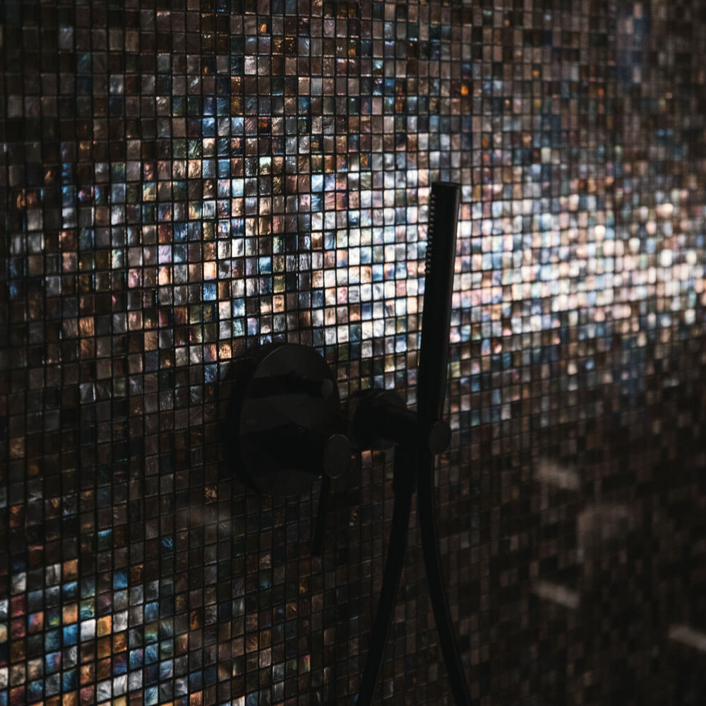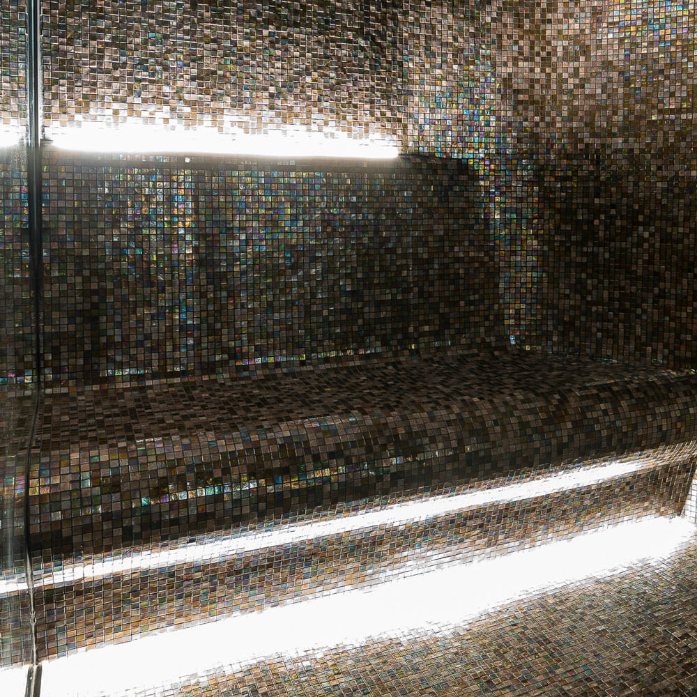 The walls, covered in mosaic tiles, create a soothing backdrop while the soft, ambient lighting from the shelves adds a subtle touch of sophistication. This is the perfect place to slow down. The dark savage and rose gold themed hammam offers a deeply calming space to recharge, while the sauna adds the perfect finishing touch to the experience.