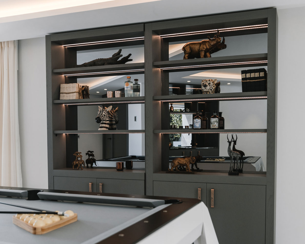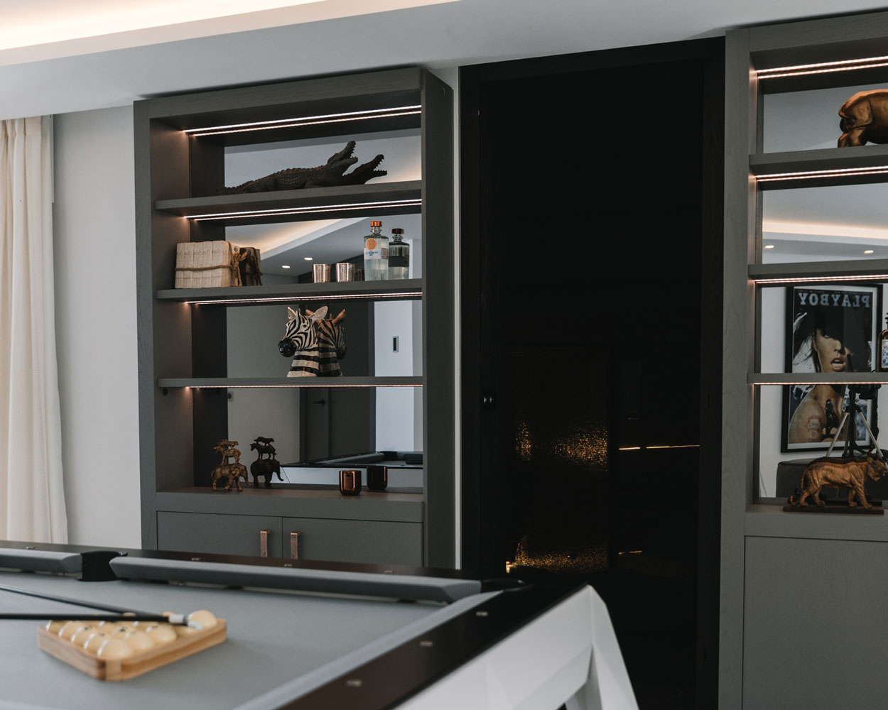 What appears to be just a sleek, custom grey bookshelf is hiding something much more exciting. A simple slide to the side reveals a hidden entrance to a private spa, offering a quiet retreat away from the world.
